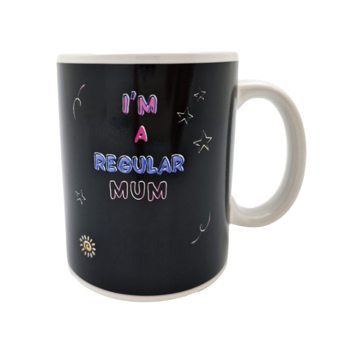 Watch the mug change colour and words appear when hot water is added. 350ml. Comes in a box. Not microwave or dishwasher safe